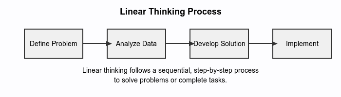 Linear thinking is a simple, step-by-step way of solving problems. Think of it as following a recipe: you start at point A, follow the instructions in order, and arrive at point B. Each step builds logically on the previous one, and there’s a clear cause-and-effect relationship throughout the process.